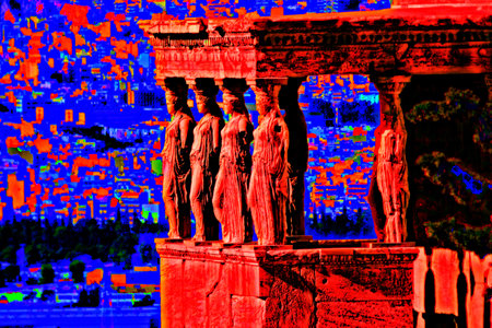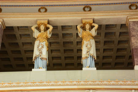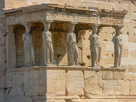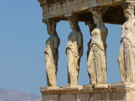 Caryatids, female draped figures, serving as supporting columns of the erechtheion, an ancient Greek temple on the north side of the acropolis of Athens
