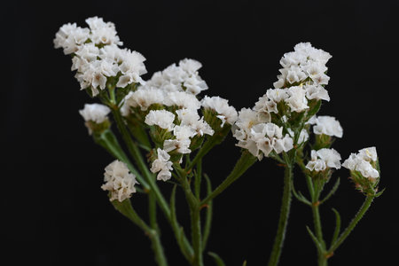 White flowers of the gypsophila. Dark mysterious background. Soft focus.