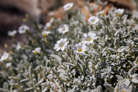 Cerastium tomentosum or snow in summer white silver evergreen flower of the family Caryophyllaceae. Low, horticultural plant, perennial, rocky, alpine plant in the garden landscape architecture design.