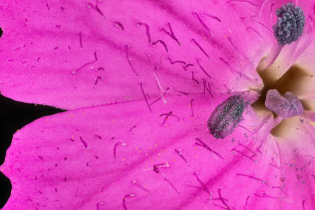 Pink wild carnation flowers - Dianthus species - under microscope, pistil with stigma and pollen particles covered stamen visible. Image width 9mm