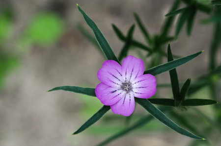 A close-up shot of a purple Corncockle flower on a blurred background