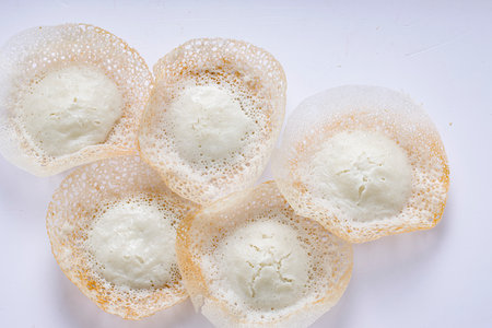 Appam or velliappam or kallappam or paalappam, tasty delicious breakfast item in south india or malabar area,made using raw rice and a good combination for veg and non veg currys ,placed on a white background.