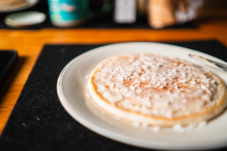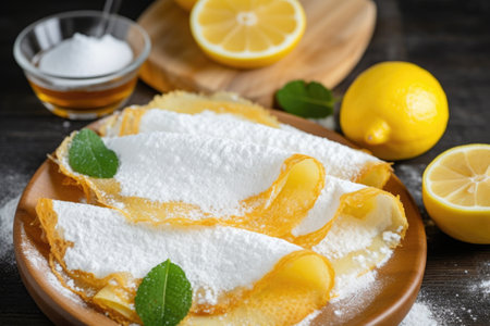 lemon slices and sugar sprinkled on crepes, created with generative ai