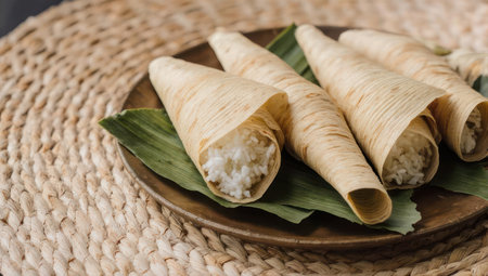 A captivating image showcasing hands delicately arranging fresh coconut on a plate filled with fragrant rice and toppings, evoking a warm culinary atmosphere.