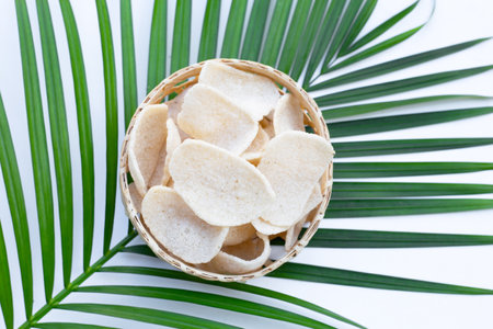 Prawn crackers in bamboo basket. Shrimp crispy rice snack