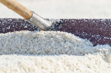 Harrow drag sea salt in harvest process at salt field in Samut Songkhram province, Thailand.