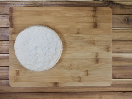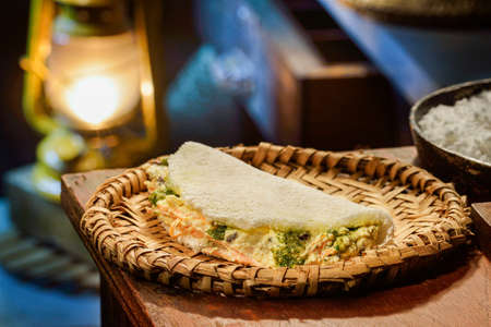 tapioca Brazilian food cuisine in wooden plate on glass table colorful interior cafe background space without people here