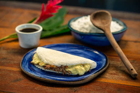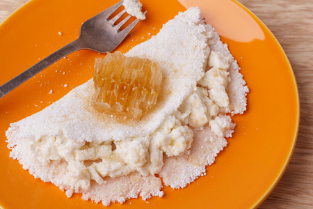 Casabe (bammy, beiju, bob, biju) - flatbread of cassava (tapioca) with ricotta and honey on plate on wooden background. Selective focus
