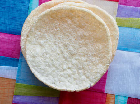 Stack of tortillas with the super-food quinoa, top view and copy space on grey background.