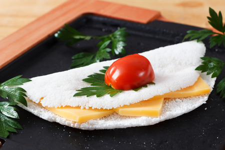 Casabe (bammy, beiju, bob, biju) - flatbread made from cassava (tapioca) with cheese, cherry tomato and parsley on pan. Selective focus. Copy space