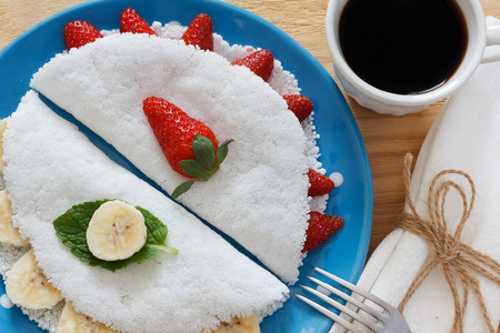 Casabe (bammy, beiju, bob, biju) - flatbread made from cassava (tapioca) with strawberry and banana and cup of coffee. Selective focus