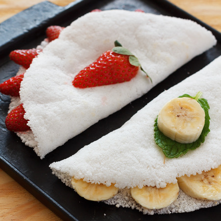 Casabe (bammy, beiju, bob, biju) - flatbread made from cassava (tapioca) with strawberry and banana. Selective focus