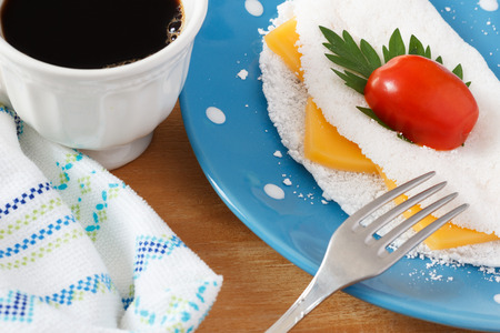 Casabe (bammy, beiju, bob, biju) - flatbread made from cassava (tapioca) with cheese, cherry tomato and parsley on blue plate with cup of coffee. Selective focus