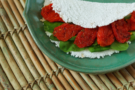 Casabe (bammy, beiju, bob, biju) - flatbread made from cassava (tapioca) with sun-dried tomatoes and rucola (arugula) on green plate. Selective focus