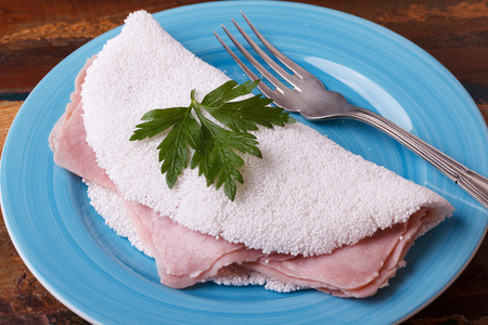 Casabe (bammy, beiju, bob, biju) - flatbread of cassava (tapioca) with ham and parsley on wooden background. Selective focus