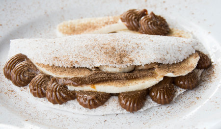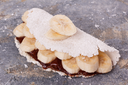 Casabe (bammy, beiju, bob, biju) - flatbread of cassava (tapioca) with banana and chocolate spread on gray stone background. Selective focus