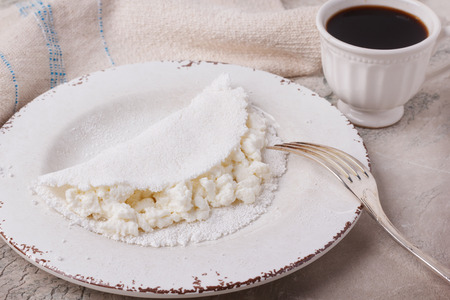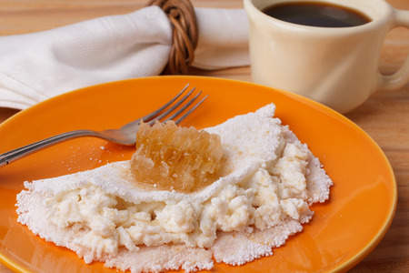 Casabe (bammy, beiju, bob, biju) - flatbread of cassava (tapioca) with ricotta and honey and cup of coffee. Selective focus