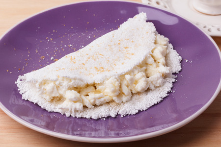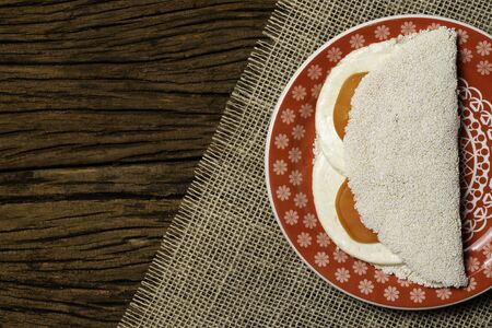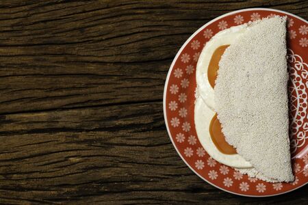 Casabe (bammy, beiju, bob, biju) - flatbread of cassava (tapioca) with ricotta on plate on wooden background. Selective focus