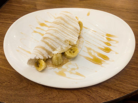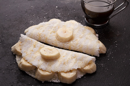 Casabe (bammy, beiju, bob, biju) - flatbread of cassava (tapioca) with banana and condensed milk and cup of coffee. Selective focus