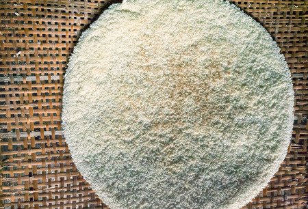 cassava flour (farinha de mandioca) in wooden bowl isolated on rustic table. food typical of brazilian cuisine