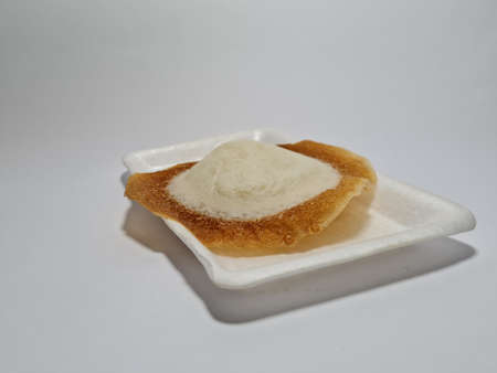 Serabi or Surabi Cake. This cake is made from rice flour with a mixture of brown sugar in the middle. Traditional food from Indonesia. White Background.