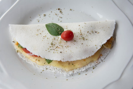 South Indian traditional breakfast Dosa or Thattu dosa made using cast iron dosa thawa, arranged in a tableware which is placed on white textured background.