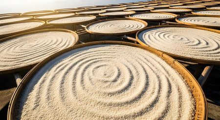 White rice grains spread out in circular patterns on large bamboo trays to dry in the sun. This traditional agricultural processing method is common in Asian rice farming cultures.