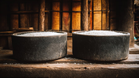 Explore the essence of traditional salt production with artisanal containers set against a rustic wooden background, highlighting a timeless culinary journey.