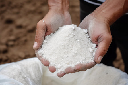 A macro shot of fine white granules in a wooden bowl on a textured blue background. Ideal for minerals, raw materials, or natural resources concepts.