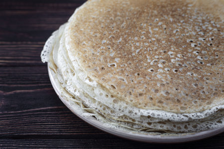 Thin Pancakes or Tortilla on Wooden Table Background Top View. Fresh Homemade Crepes or Flatbread Flat Lay with Space for Text