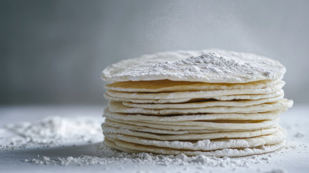 A stack of flour tortillas with a dusting of flour on top, placed on a white surface, emphasizing their fresh preparation.