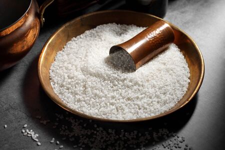 Basket salt on pan at home in countryside.