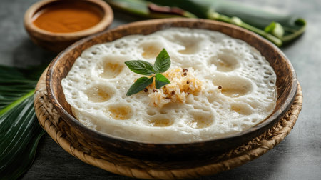 Idiyappam with coconut milk and curry, a Sri Lankan delicacy. Copy space available.