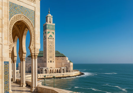 Hassan II Mosque, Casablanca, Morocco – The majestic Hassan II Mosque stands on the Atlantic coast in Casablanca, Morocco, under a bright blue sky. Its tall minaret, ornate arches, and intricate Moroccan architectural details reflect in the ocean below, creating a serene and impressive view of one of the largest mosques in the world.