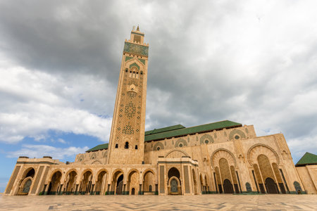 Angular perspective of the Hassan II Mosque showing minaret, arched facades and large square in dramatic cloudy weather, Casablanca, Morocco