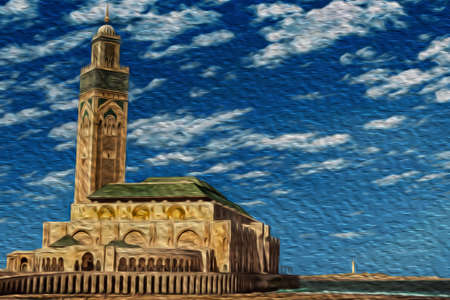 Hassan II mosque with its huge and colorful minaret, beside the sea in Casablanca. Located on the Atlantic coast this city is considered the economic and business center of Morocco. Oil paint filter.