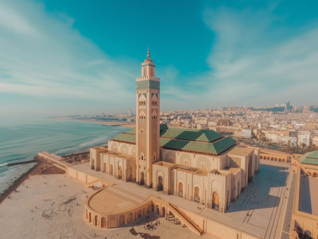 A stunning aerial view of a grand mosque by the sea, showcasing intricate architecture and a blend of tradition with the urban landscape.