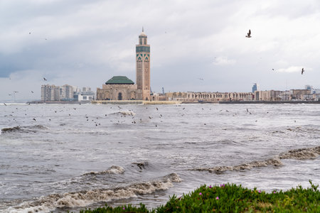 Casablanca, Morocco -march 25, 2024:view of the famous Hassan Second Mosque during a rainy day
