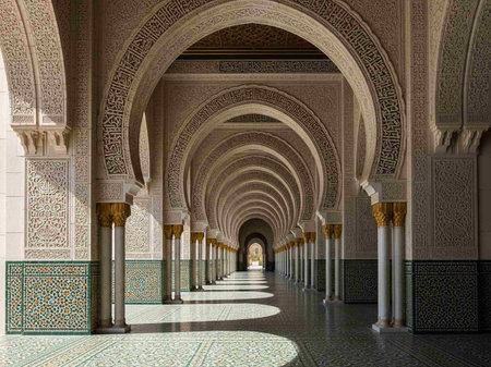 Partial view of the museum area of The Hassan II Mosque - large, elaborate oceanfront mosque, built in 1993, with intricate decor & a soaring, 210-m. minaret.
