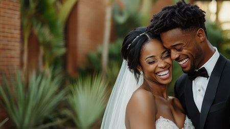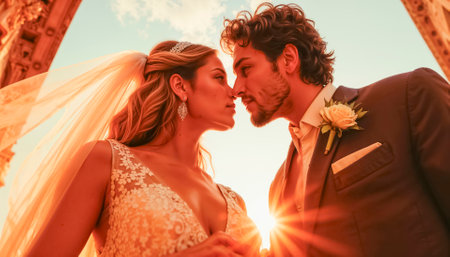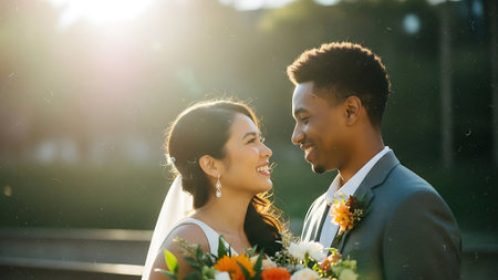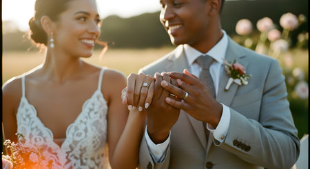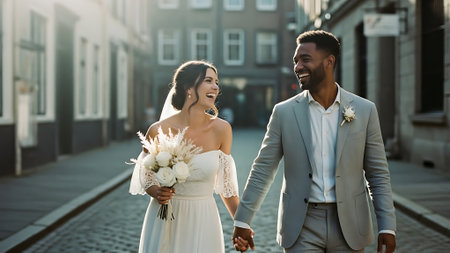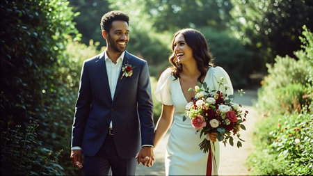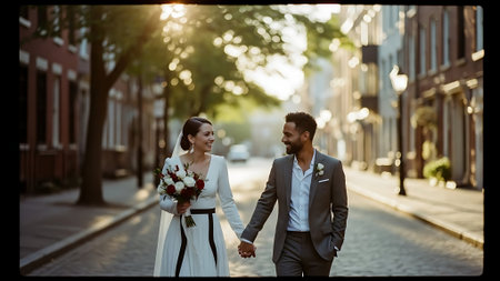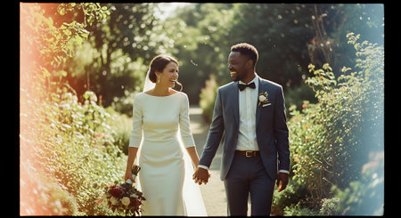 A newly married couple, a man in a black suit and a woman in a white gown, walk hand in hand. The scene evokes love, commitment, and celebration on their special day, with soft lighting and an intimate feel.