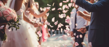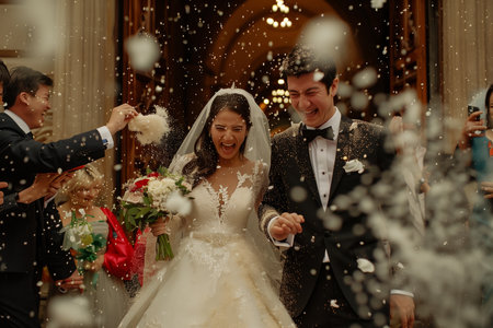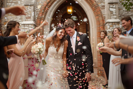 Joyous wedding scene with bride and groom, confetti rain, colorful, festive atmosphere. AI generative.