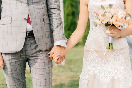 Bride and groom hold bouquet of flowers in hands and dressing on the rings.