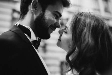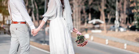 Beautiful wedding couple walking on the street in the city. Bride and groom