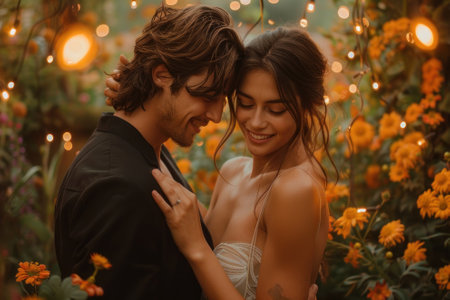 A couple in love dancing under a canopy of fairy lights in a garden filled with blooming flowers.