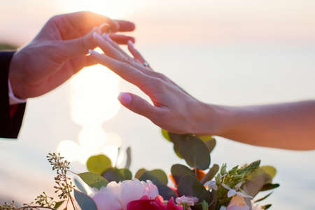 Groom puts wedding ring to the bride's hand at sunset near the sea