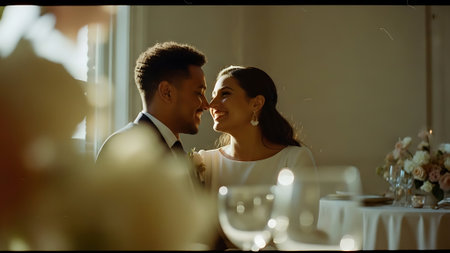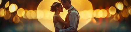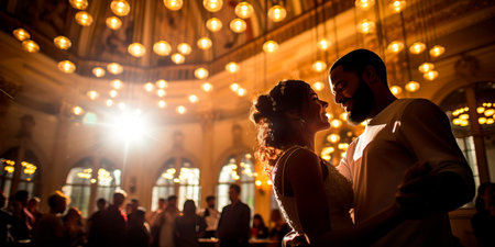 Backlit scene with a newlywed couple dancing. sensitivity and a happy family Generative AI and newlyweds