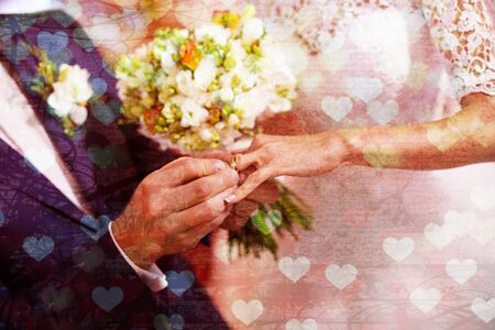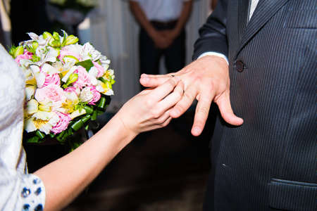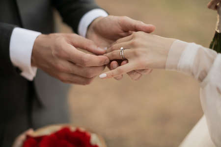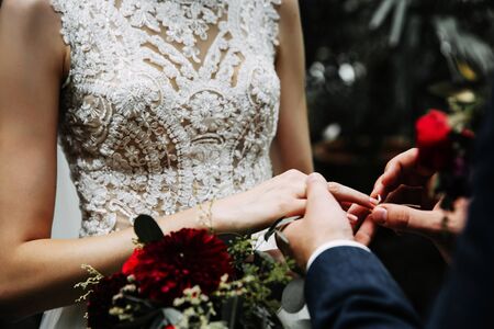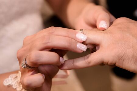 The groom or husband puts the ring on the bride or wife of the wedding ceremony. Wedding event.