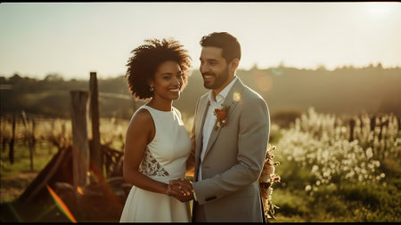 A smiling bride and groom hold hands, standing together in a beautiful outdoor setting with flowers and a sunny field in the background, wearing formal wedding attire.