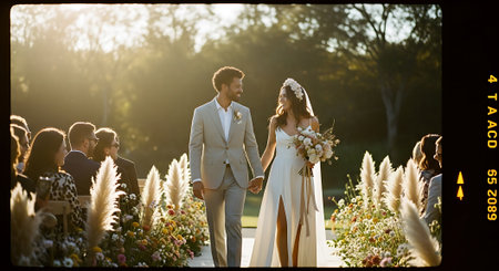 A smiling bride and groom in formal attire walk hand-in-hand down an outdoor aisle lined with vibrant flowers, pampas grass, and seated guests, bathed in warm sunlight.