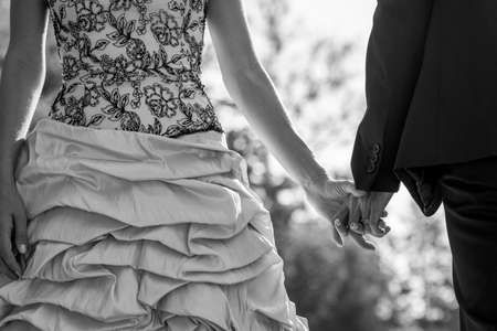 Close up on bride in fancy ruffled dress and groom holding hands in black and white.